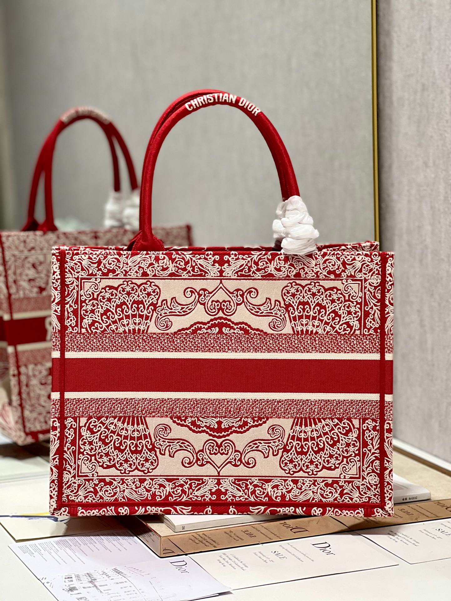Dior Croce Heart Red 【Medium】 Embroidered Shopping Bag
